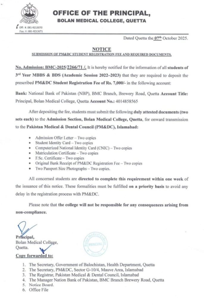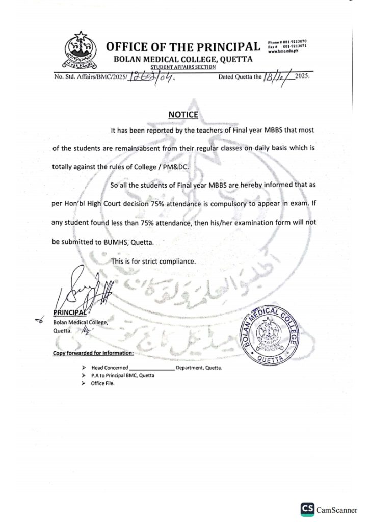 The grievance and physical verification of the male new first year students (session 24-25) for allotment of Hostel Bolan Medical College, Quetta will take place on 24th of July 2025.