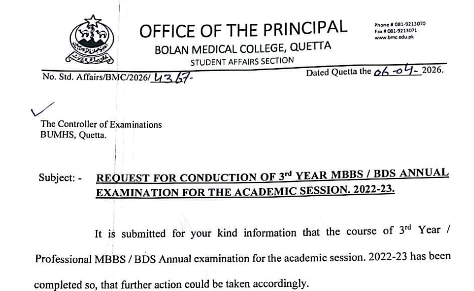 admin April 8, 2026 Latest News, News 1 view 3rd year MBBS/BDS Annual examination for the academic session 2022-23