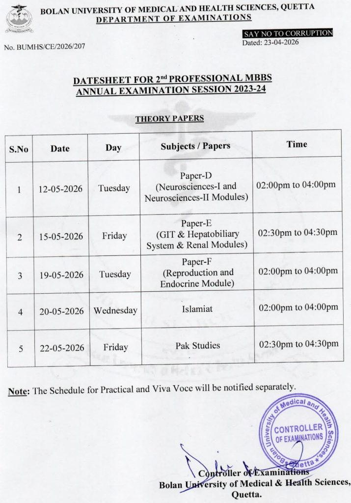 admin April 24, 2026 Latest News, News 4 views Exam Schedule for 2nd Professional MBBS Annual Examination Session 2023-24