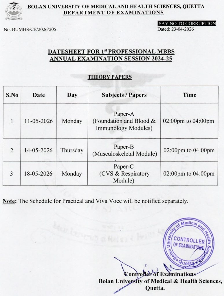 admin April 24, 2026 Latest News, News 4 views Exam Schedule for 1st Professional MBBS Annual Examination Session 2024-25