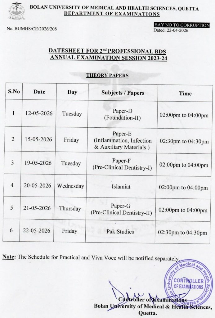admin April 24, 2026 Latest News, News 3 views Exam Schedule for 2nd Year Professional BDS Annual Examination Session 2023-24