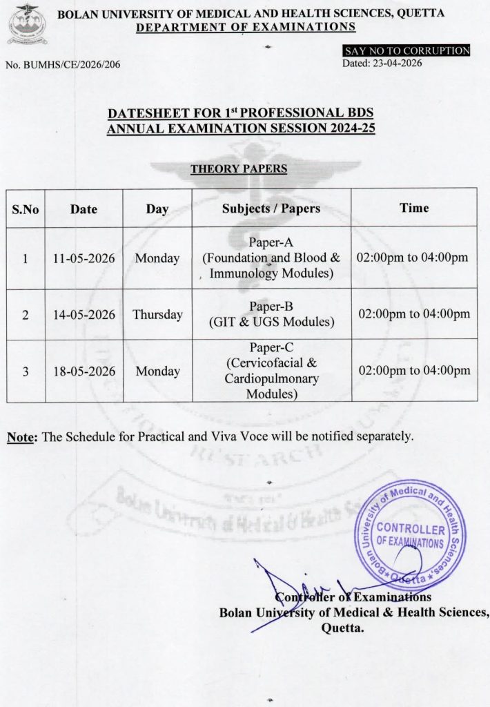 admin April 24, 2026 Latest News, News 4 views Exam Schedule for 1st Professional BDS Annual Examination Session 2024-25
